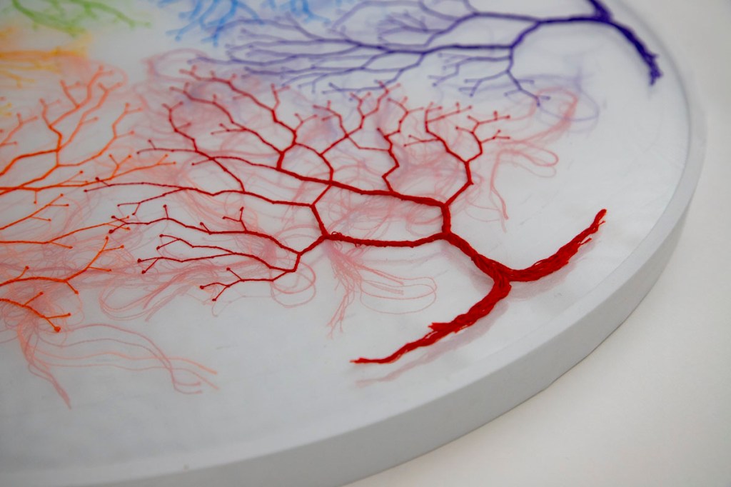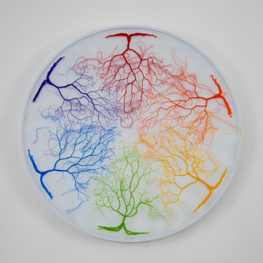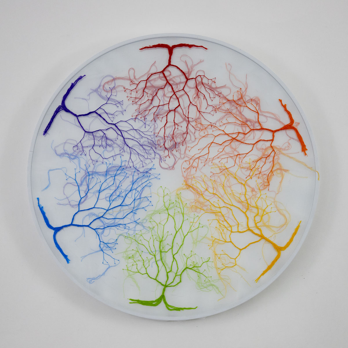 This work is created from thread embroidered in intricate patterns onto translucent voile fabric and mounted on a mirrored background. The six ‘trees’ in the image can be read as the intertwining trees of life (symbols of oneness and unity representing the interconnectedness of life on Earth), as life-giving veins and as family trees, with all the messiness of family life visible under the surface. Use of the six PRIDE colours implies inclusion of all within the circle, while the mirror alludes to eternal repetition, and the subtle inclusion of the viewer in the work.