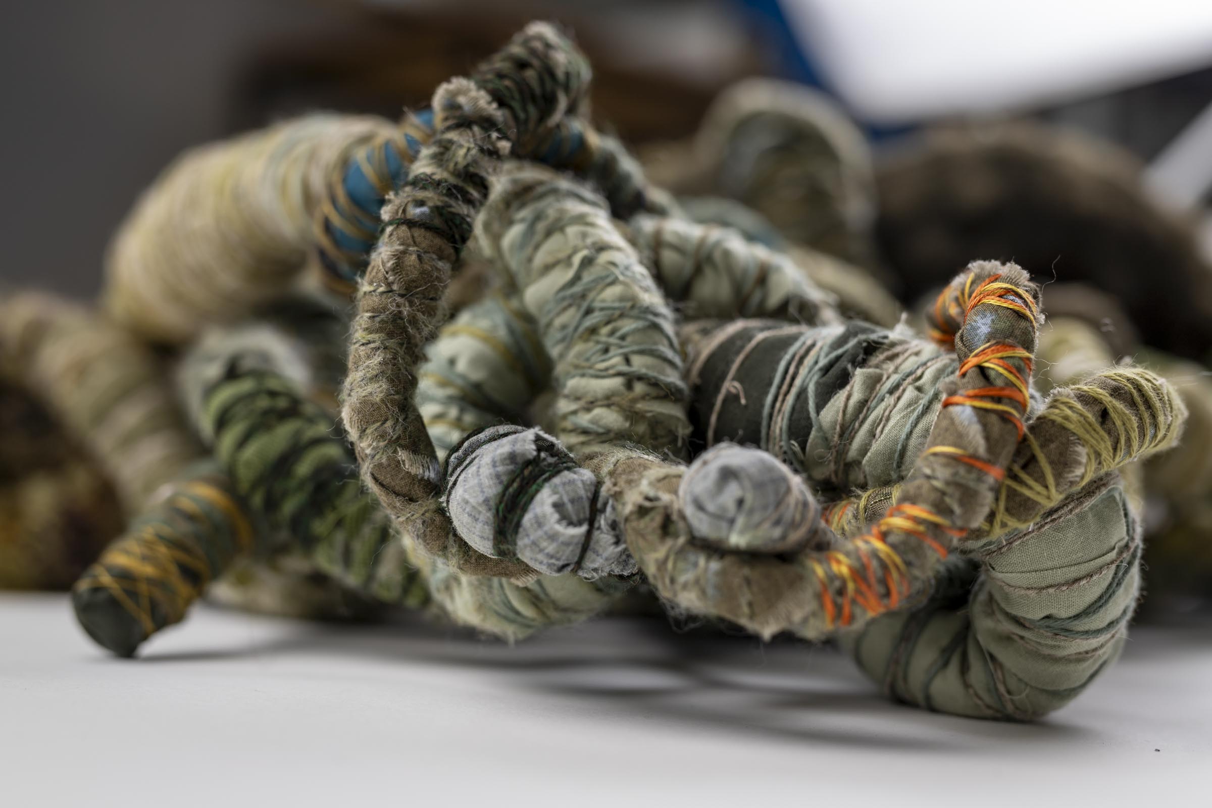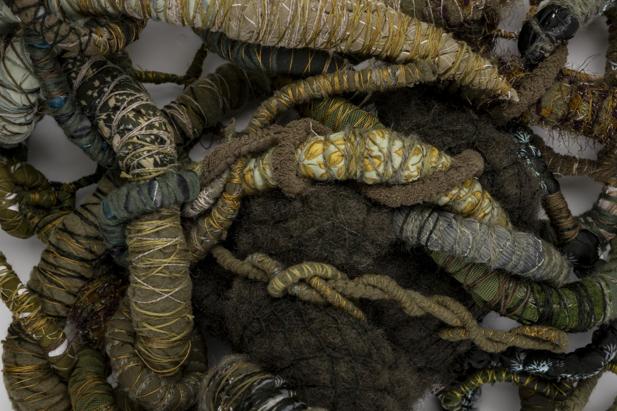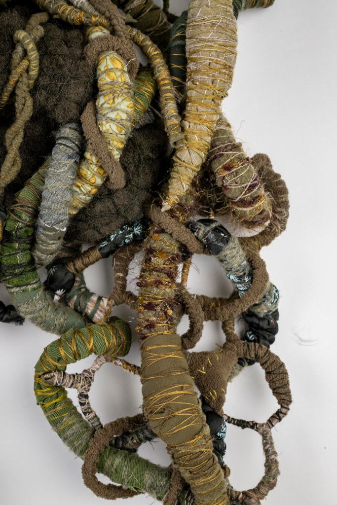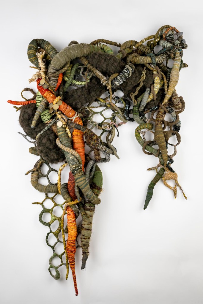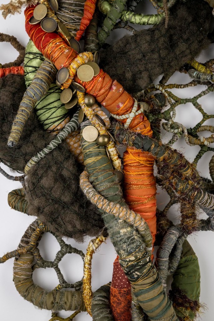 SOLDDate: October 2024Size: 1300x900x200mmMedia: Fabric, yarn, thread, wire, batting, brass buttons and pendants.