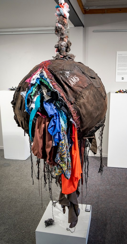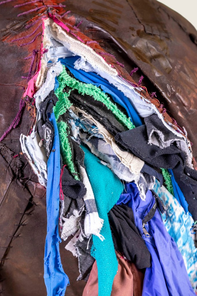 Date: September 2023Size: 1800x700mmMedia: clothes and other fabric, thread, yarn, steel rod, paint, rope.