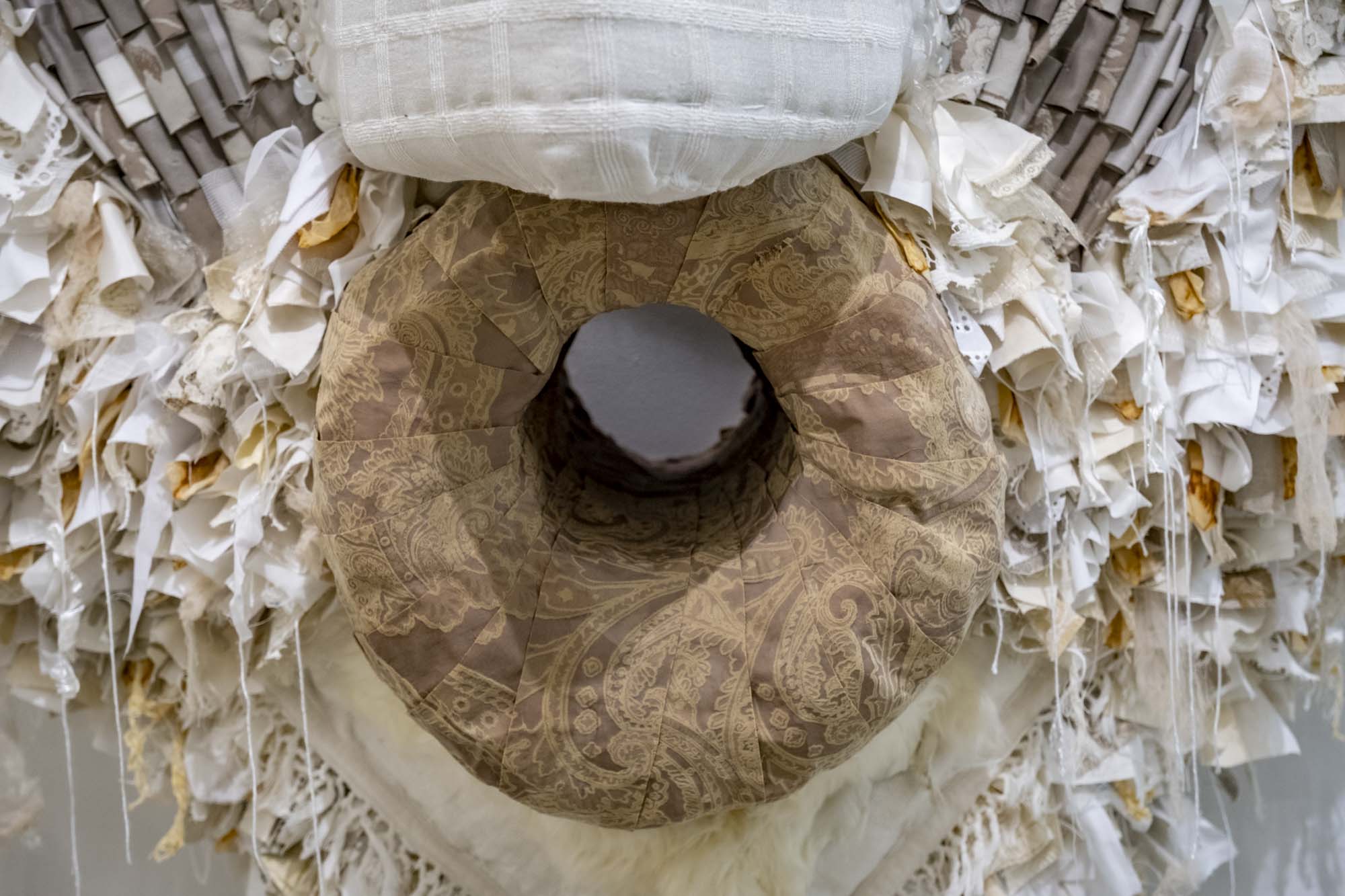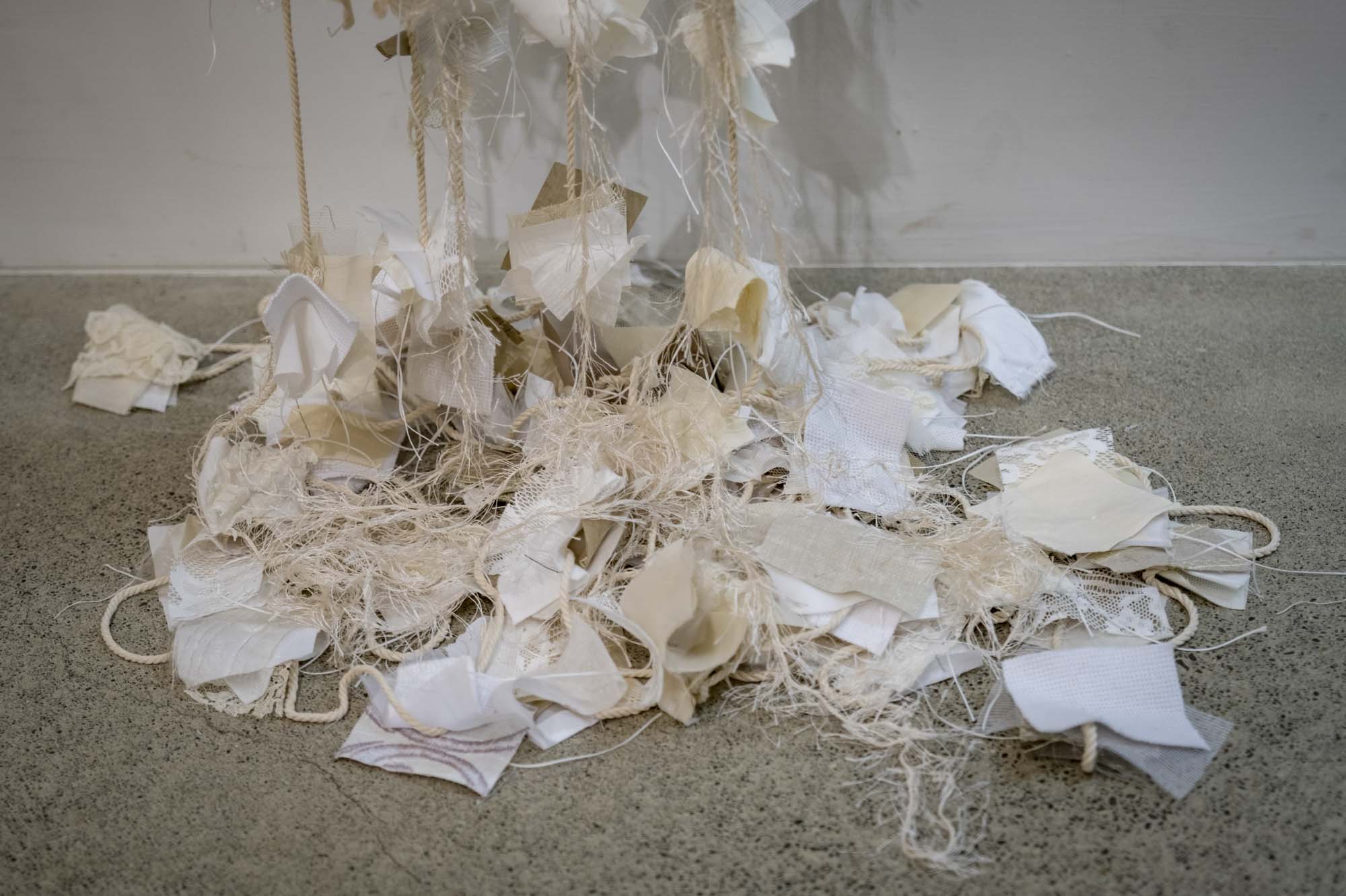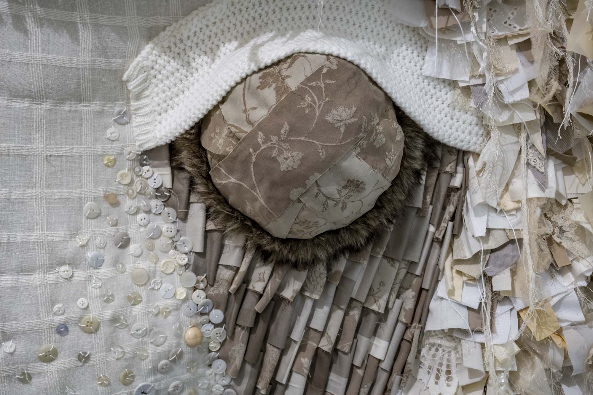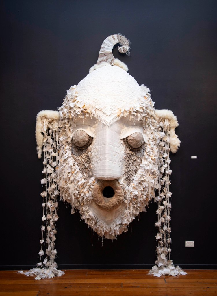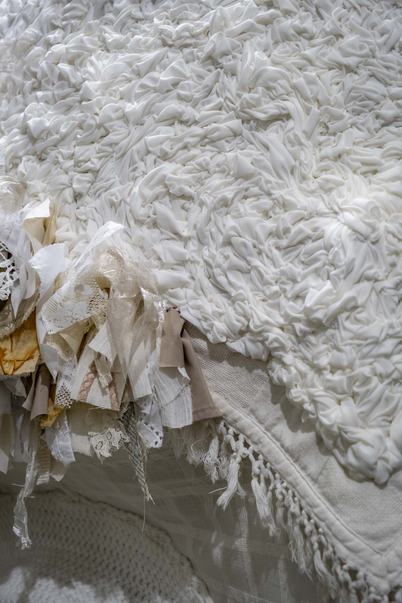 Date: November 2023Size: 3000x1500mmMedia: fabric, yarn, thread, batting, cardboard, sheep skin, tea bags, rope.